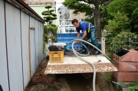 引き網等を使い錦鯉を回収し、錦鯉専用輸送車の水槽に移します。一時預り池まで輸送します。 |
