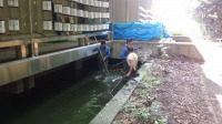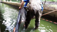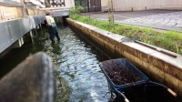 引き網等を使い錦鯉を回収し、仮設水槽に移します。