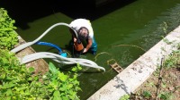 水中ポンプセットを使用し、池の水をどんどん抜いてゆきます。